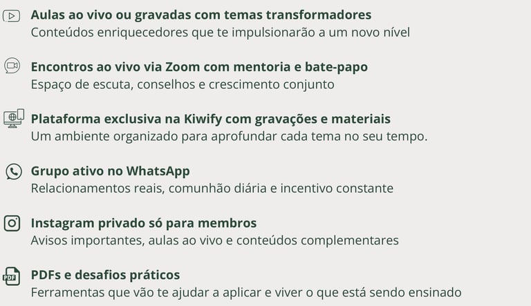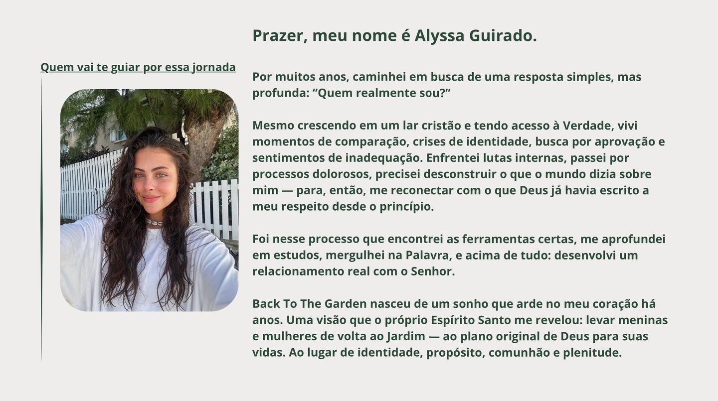 O Back To The Garden é um ambiente seguro, profundo e intencional onde meninas e mulheres crescem juntas em todas as áreas da vida: espiritual, emocional, física, profissional e relacional.