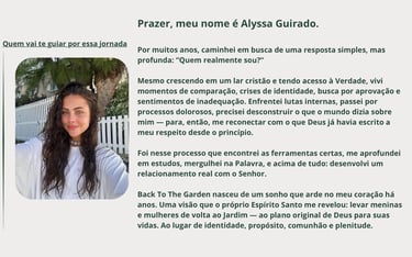 É uma jornada de cura, identidade, pertencimento e transformação. Aqui, voltamos à origem, ao jardim, ao lugar onde tudo começou — o lugar onde Deus nos desenhou.