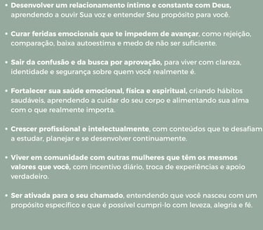 Uma comunidade de meninas e mulheres comprometidas com um desenvolvimento integral — espírito, alma e corpo — vivendo com intencionalidade para cumprir o desenho original de Deus para suas vidas.